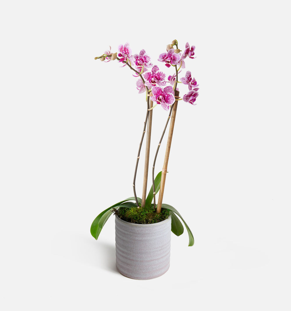 Exotic and long lasting, orchids symbolize love, strength, and beauty. The Goddess, a stunning double Spike pink spotted Orchid in a bglazed light purple vessel, is a perfect Valentine’s Day gift for family, friends, or that special someone. These long-lasting blooms express admiration and appreciation, making them a thoughtful and timeless gesture.