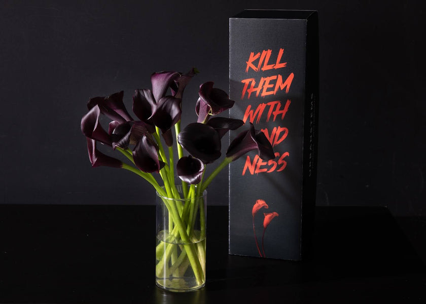 These black calla lilies are our testament to all things, dark, moody, seductive, and spooky. The color is a glossy purple/black that strikes such an interesting contrast against the flowers’ graceful green stems. So, let’s dig a little deeper into what makes these flowers so special.