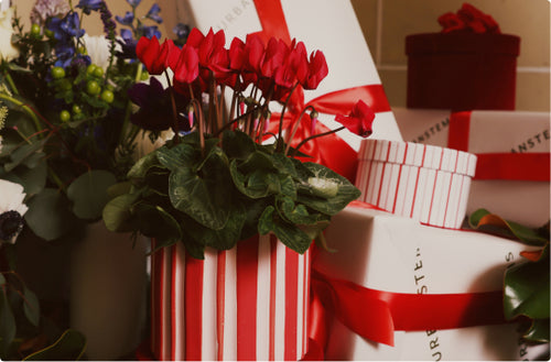 Levain's iconic cookies and holiday tin paired with fresh florals.