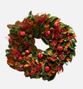 Handcrafted by skilled artisans from The Magnolia Company farm in Central Florida, this wreath features farm-fresh Magnolia leaves, meticulously sorted and arranged into a lush, verdant circlet. Tastefully festive accents of cherry red flax berries, ruby pomegranates, and natural pine cones are neatly tucked between the layers, creating a cheerful yet timeless holiday display. Perfect for adding a touch of traditional elegance to anyone's door this season.