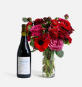 Roses, Anemones, Ranunculus, Scabiosa, Carnations, Mini Carnations, Greenery paired with One bottle (750 mL) of Avaline Syrah, a rich, bold red featuring notes of crushed violets, juicy blackberries and a hint of cocoa.