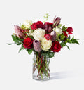 Do you remember that elated feeling of waking up on Christmas Morning? This bouquet delivers that delight, but in floral form. Classic red and white roses, holiday red ranunculus, and a variety of berries frolic amongst one another like the gifts you unwrap on Christmas morning.