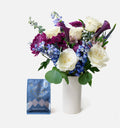 Roses, Mini Callas, Veronica, Delphinium, Alstroemeria, Mums, Thistle, Eucalyptus in a 3.75" x 8" White Textured Ceramic Vase with Ritual Chocolate 8oz. Mid Mountain Blend Hot Chocolate