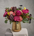 Roses, Garden Roses, Carnations, Spray Roses, Ranunculus, Mini Calla Lilies, Leucadendron, Eucalyptus paired with a 5" x 5.5" Hammered Gold Metal Vase