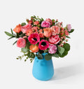 Garden Roses, Spray Roses, Anemones, Ranunculus, Hypericum, Ruscus, Eucalyptus in a 8" x 5.5" Cerulean Demi-Gloss Ceramic Vase