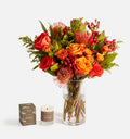 Autumn evenings just got more luxurious with The Evening Ember—our Spice bouquet featuring warm orange tones paired with a True Hue votive candle in Wood Smoke + Nutmeg. Perfect for creating ambiance at dinner parties or as a birthday gift for someone who appreciates life's finer moments. Sometimes the best nights are the ones that smell like autumn and look like art.