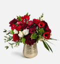 We want you to be the star of the holiday party this year, and this bouquet is your perfect plus one. Rich reds, bright pops of white, and lush green accents are beautifully arranged in a short gold hammered vase. With this stunning centerpiece by your side, your invite to next season’s soiree is practically guaranteed.