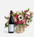 A centerpiece made for lingering conversations and one more pour. The Nightcap pairs Avaline’s bold Syrah (rich with notes of crushed violets, blackberries, and cocoa) with a luxe arrangement of deep purples, soft whites, and seasonal greens in a hammered gold vessel. Full-bodied and quietly indulgent, it’s an elegant choice for holiday dinners or as a gift for your favorite host.
