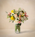 Timeless elegance is the hallmark of this classic bouquet of roses and ranunculus. It boasts pastel shades of pink, accents of yellow and cream, and highlighted by spiral eucalyptus with green sprigs. The Pink Lady is a perfect centerpiece for a spring brunch al fresco or to liven up a kitchen or dining room. This arrangement makes a gracious thank-you gift, but it’s just as delightful as a gift for yourself because you deserve it.
