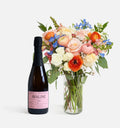 A pairing that feels like the last light of day: warm, luminous, and quietly celebratory. This seasonal bouquet mixes peach, blush, and amber tones with sprigs of blue delphinium, while Avaline’s Sparkling Rosé adds a crisp, effervescent finish with notes of raspberry and citrus. Together, they make the kind of gift that instantly brightens the room—perfect for celebrations, family gatherings, or any moment worth lingering over.
