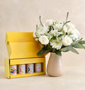 A thoughtful pairing for those who appreciate restraint and craft. This neutral bouquet features an elegant arrangement of pure white blooms, designed to convey calm, grace, and understated beauty. Paired with Brightland’s Classic Minis Gift Set, this duo brings together floral simplicity and culinary artistry. The set includes Brightland’s signature extra-virgin olive oils, Awake and Alive, alongside their flavored oils Rosette Garlic and Lucid Lemon, all in perfectly giftable mini sizes. Ideal for hosts, food lovers, or moments that call for something quietly special.