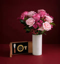 Roses, Spray Roses, Hypericum Berries, Ruscus paired with a ROE Gift Set featuring 30 gm Kaluga caviar, a key opener, Mother of Pearl caviar spoon, and a custom ROE presentation box.