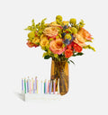 Our top-selling Firecracker bouquet takes center stage, bursting with vibrant orange and yellow hues that feel as radiant as a birthday wish. Styled in a dappled glass vase in a rich topaz tone, the arrangement brings warmth and sparkle to the celebration. Tucked alongside is a playful birthday card that reads “Age is just a number—who’s counting anyway?” with a dazzling display of gold-foiled candles inside. Bold blooms, a statement vase, and a cheeky card make this the ultimate birthday trifecta.
