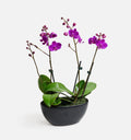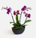 A vibrant orchid garden with bold berry tones that pop against its sleek black matte vessel. Consider it a design that brings color and energy when the days feel shortest.